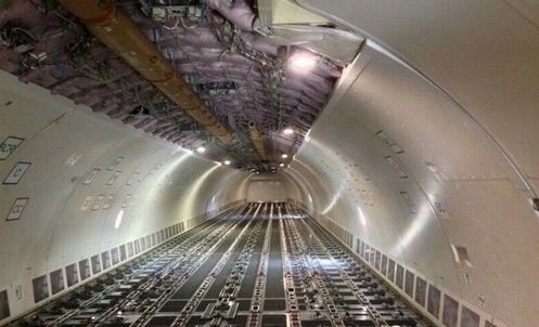 4.裝貨前,我們看看飛機內部結構吧,地板上有專門用來和集裝箱(集裝板)相扣的鎖止結構,防止集裝箱(集裝板)滑動: