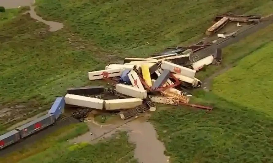 據悉,脫軌事故發生在一個平交道口附近。該列車有16節車廂,發生脫軌后,集裝箱被掉落在軌道兩側,部分集裝箱還掉在了相鄰的圍場內。