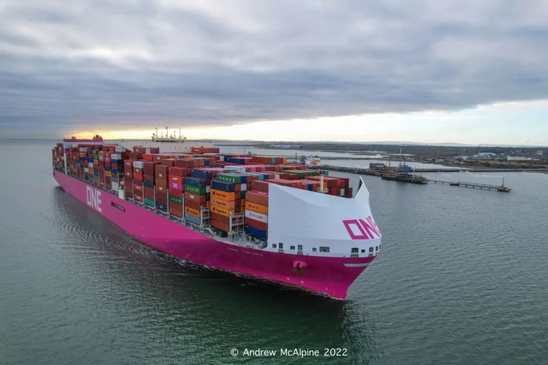 如上圖所示,這艘船佩戴了一張“口罩”集裝箱船是日本航運(yùn)公司ONE一團(tuán)旗下的一艘ONETRUST超大型集裝箱船,服務(wù)于TheAlliance聯(lián)盟的FE2亞歐航線。