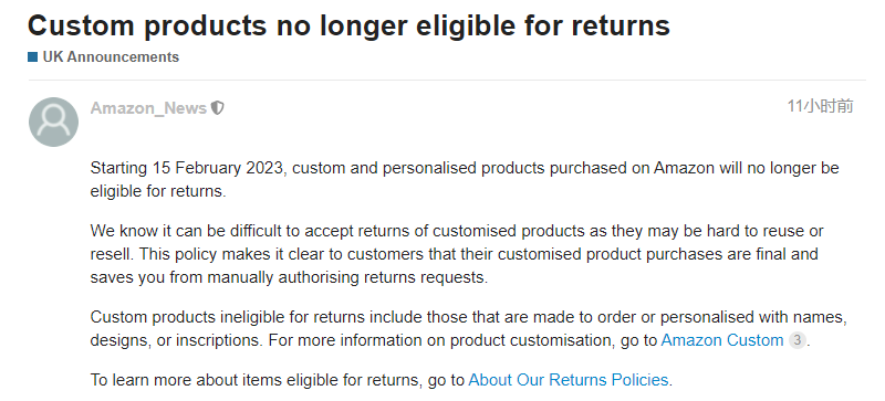 亞馬遜宣布,自2023年2月15日起,亞馬遜上的定制商品將不再符合退貨條件。