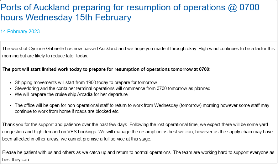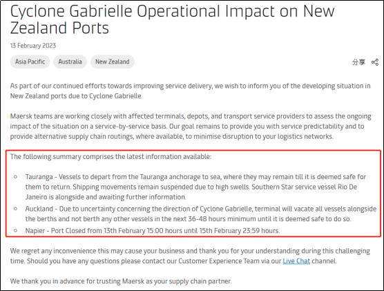2月13日,馬士基發布通知稱,他的團隊正在與新西蘭受影響的碼頭、倉庫和運輸服務提供商密切合作,以評估逐項服務的持續影響。在可行的情況下提供替代供應鏈路線,以最大限度地減少物流網絡的干擾。