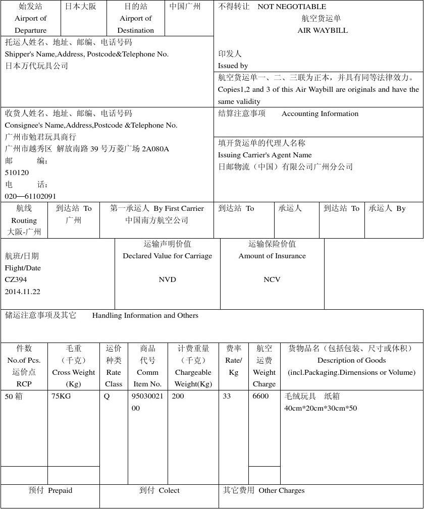 航空貨運單是由托運人或者以托運人的名義填制,是托運人和承運人之間在承運人的航線上運輸貨物所訂立運輸契約的憑證。 航空貨運單不可轉(zhuǎn)讓,屬于航空貨運單所屬的國際空運企業(yè)。