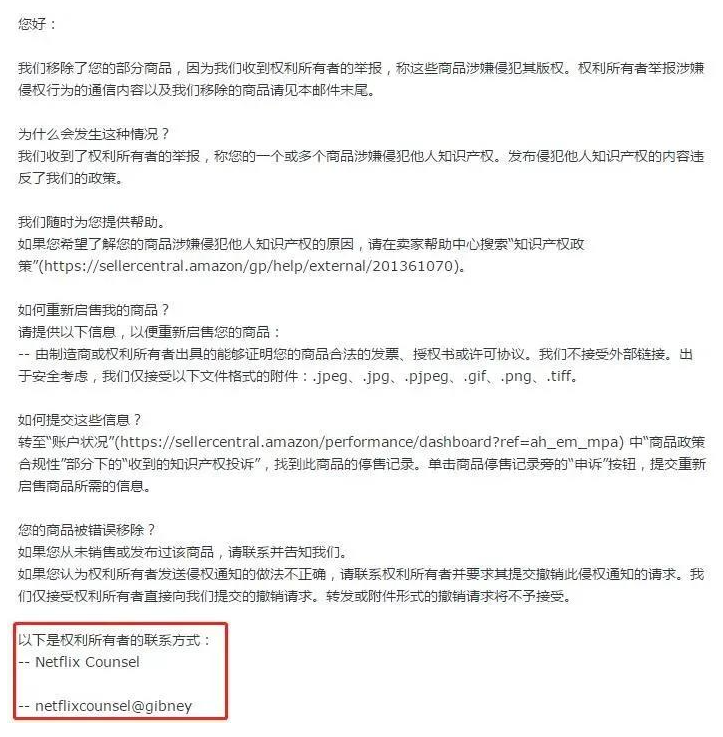 目前版權的處理上,除Netflix親自下場投訴外,還有平臺的檢測,另外還有一家名為BrandShield的在線威脅追蹤公司,也在進行批量檢測并投訴。投訴力度非常大,甚至有賣家表示自己后臺收到的侵權警告已經超過了上百條。