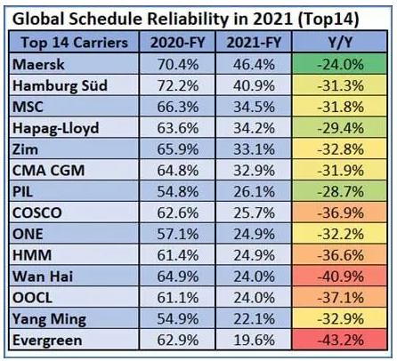 畢竟如今的國際海運準班率達到了十年內的最低,上海航交所發布的2022年1月全球主干航線綜合準班率指數僅為24.09%;而根據Sea-Intelligence跟蹤研究的14家船公司的2021年船期準班率,達飛以32.9%排名第六位。